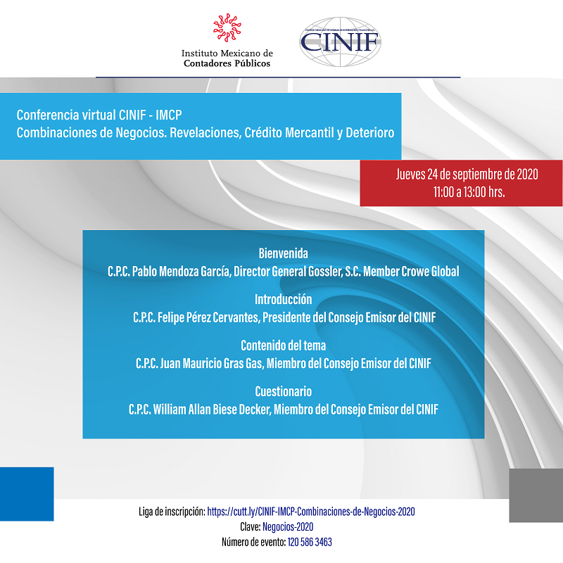 El Comité Ejecutivo Nacional (CEN) del Instituto Mexicano de Contadores Públicos (IMCP), por medio de su Presidente, C.P.C. y Mtra. Diamantina Perales Flores, los invitan a participar en la conferencia virtual denominada Combinaciones de Negocios. Revelaciones, Crédito Mercantil y Deterioro, organizada por el Consejo Mexicano de Normas de Información Financiera (CINIF) y el Instituto Mexicano de Contadores Públicos, A.C., con temas relevantes para nuestra profesión.