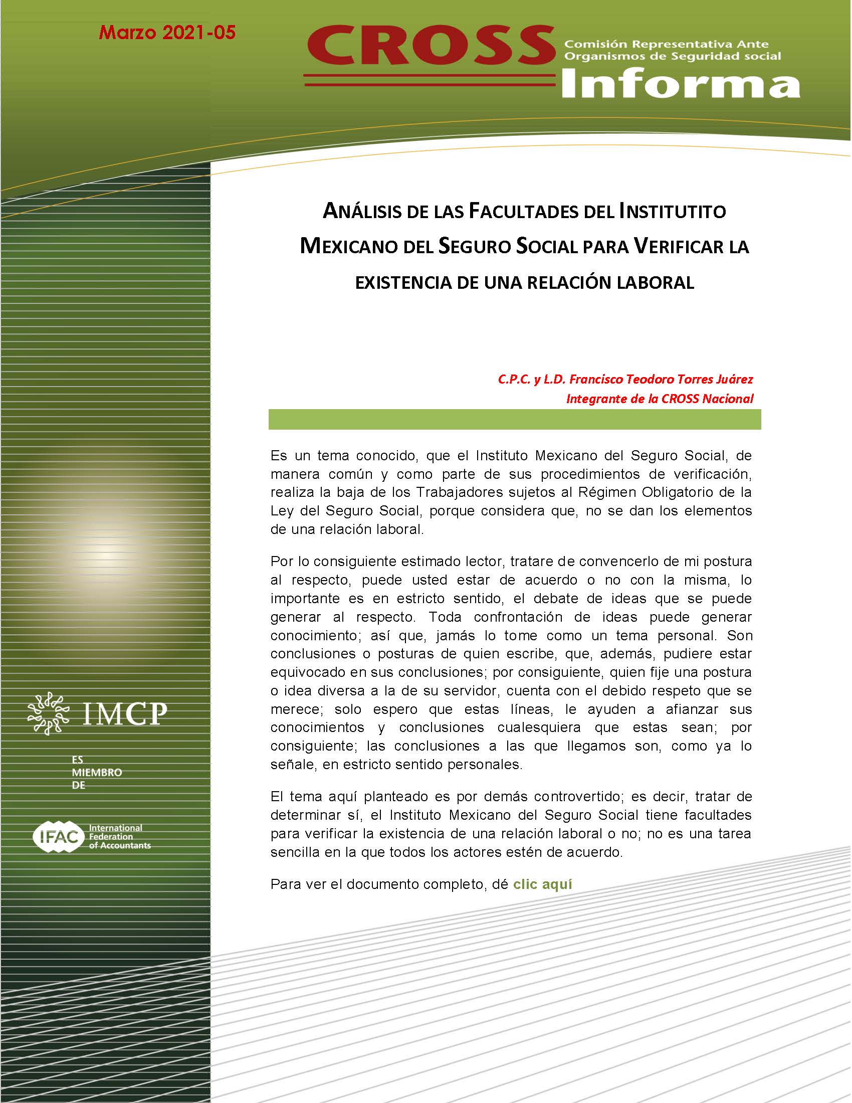 CROSS Informa 2021-05 ANÁLISIS DE LAS FACULTADES DEL INSTITUTO MEXICANO DEL SEGURO SOCIAL PARA VERIFICAR LA EXISTENCIA DE UNA RELACIÓN LABORAL