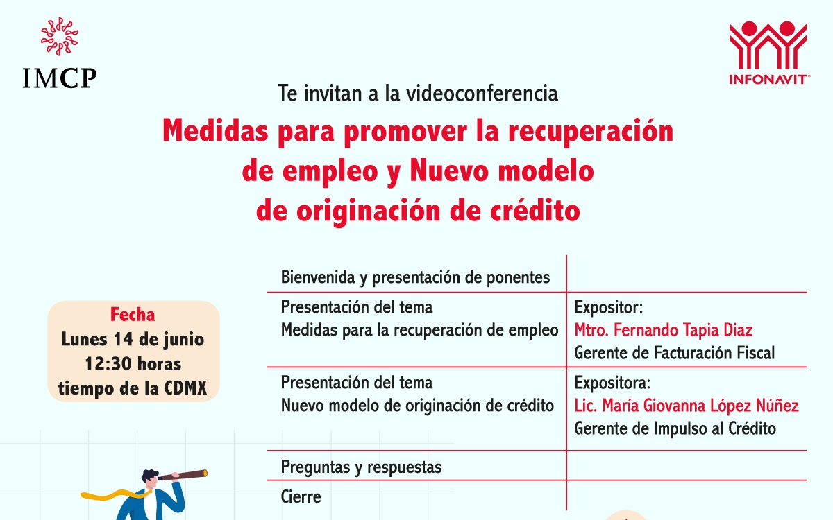 Medidas para promover la recuperación de empleo y Nuevo modelo de originacion de crédito admin_imcp Eventos, Eventos de Aniversario, Primera Plana, Servicios 17 junio, 2021 https://youtu.be/MQ1k_49kz68 Navegación de entradas Previous post A continuación, compartimos la nota relevante del día. Banxico enciende la alerta: hay riesgos en el sistema financieroNext post IMCP | Síntesis Informativa 18 Junio 2021