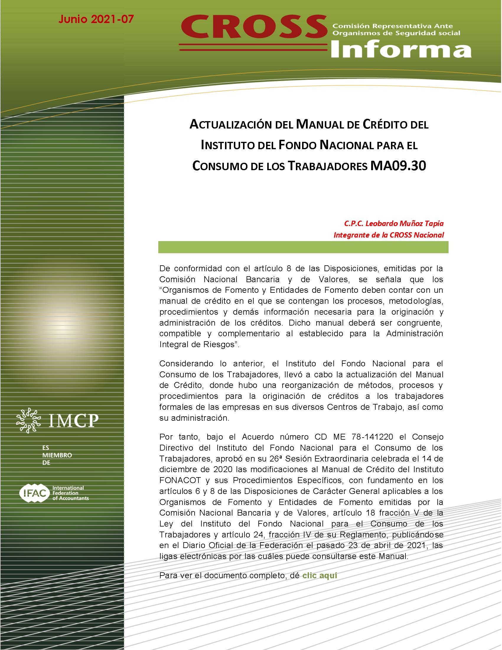 CROSS Informa 2021-07 ACTUALIZACIÓN DEL MANUAL DE CRÉDITO DEL INSTITUTO DEL FONDO NACIONAL PARA EL CONSUMO DE LOS TRABAJADORES MA09.30