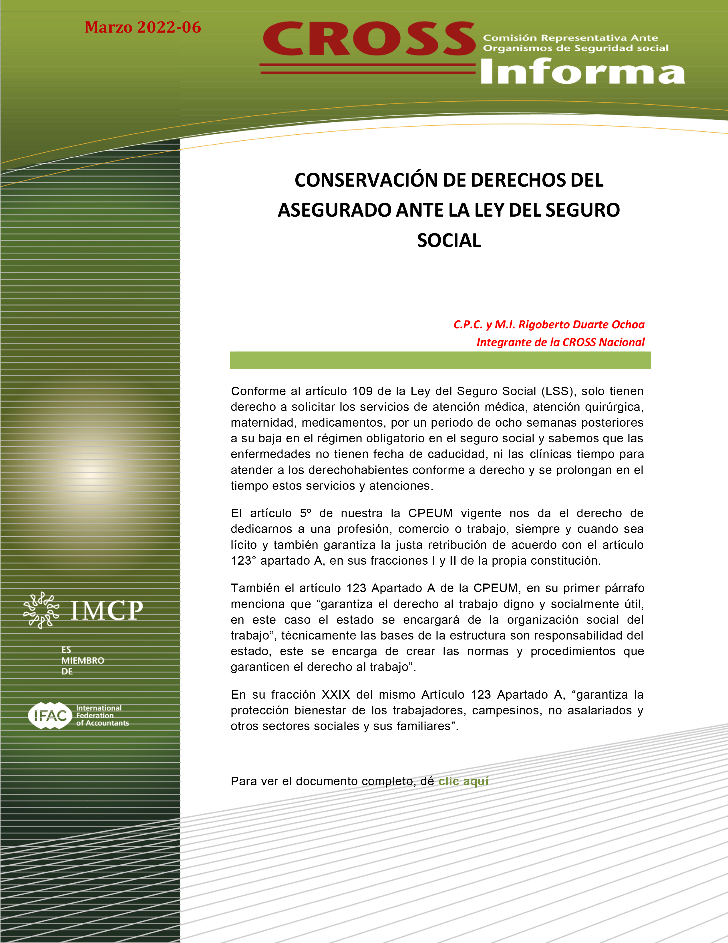 Boletín de Noticias de la CROSS 2022-06 CONSERVACIÓN DE DERECHOS DEL ASEGURADO ANTE LA LEY DEL SEGURO SOCIAL