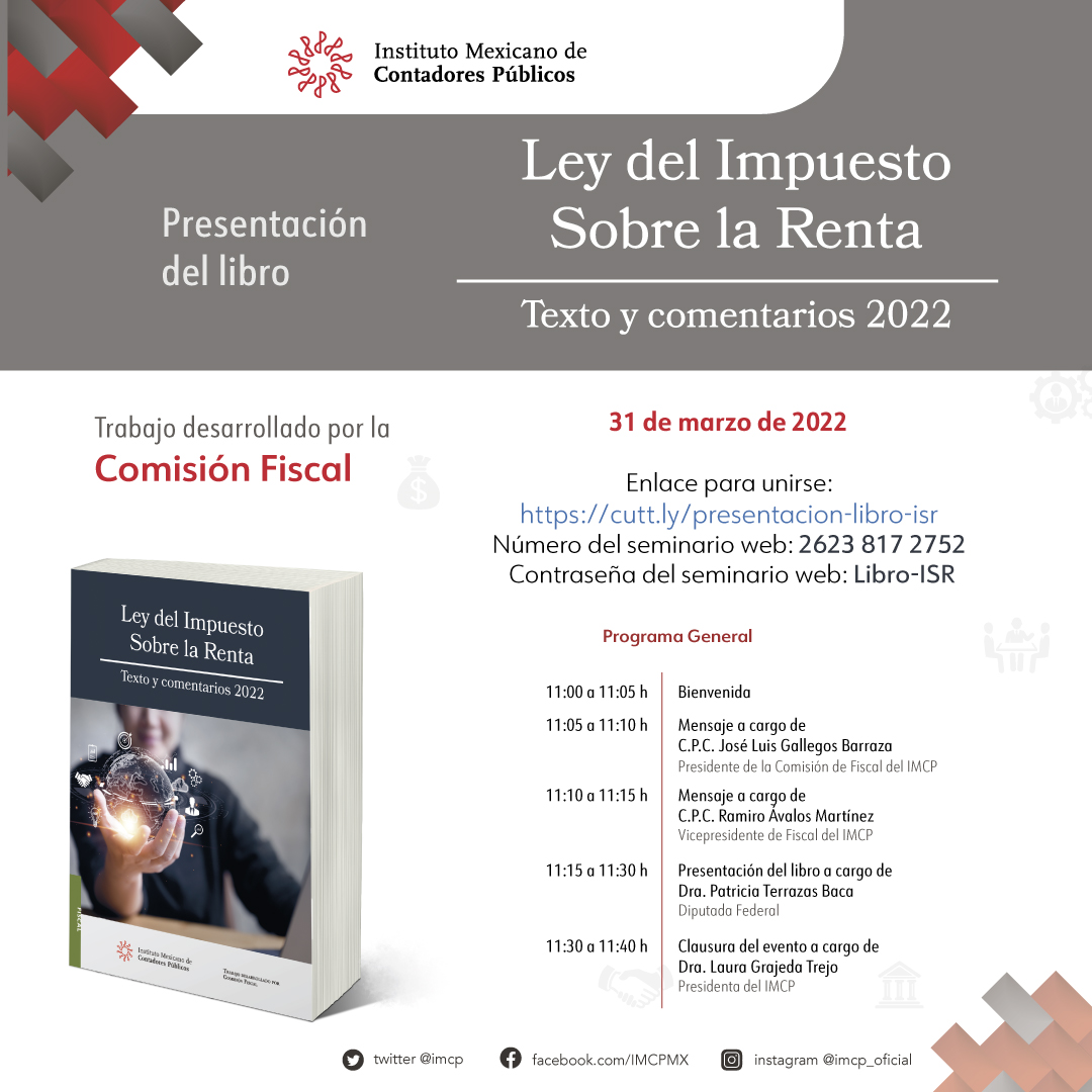 Durante la presentación del libro Ley del Impuesto sobre la Renta. Texto y comentarios 2022, realizado por la Comisión Fiscal del IMCP, la Dra. Grajeda señaló que, con un lenguaje sencillo y accesible, los expertos del Instituto analizan y comentan dicha disposición, con el objetivo de “apoyar a las todas las personas involucradas en la práctica impositiva, posibilitándoles conocer con mayor detalle la Ley del ISR”.