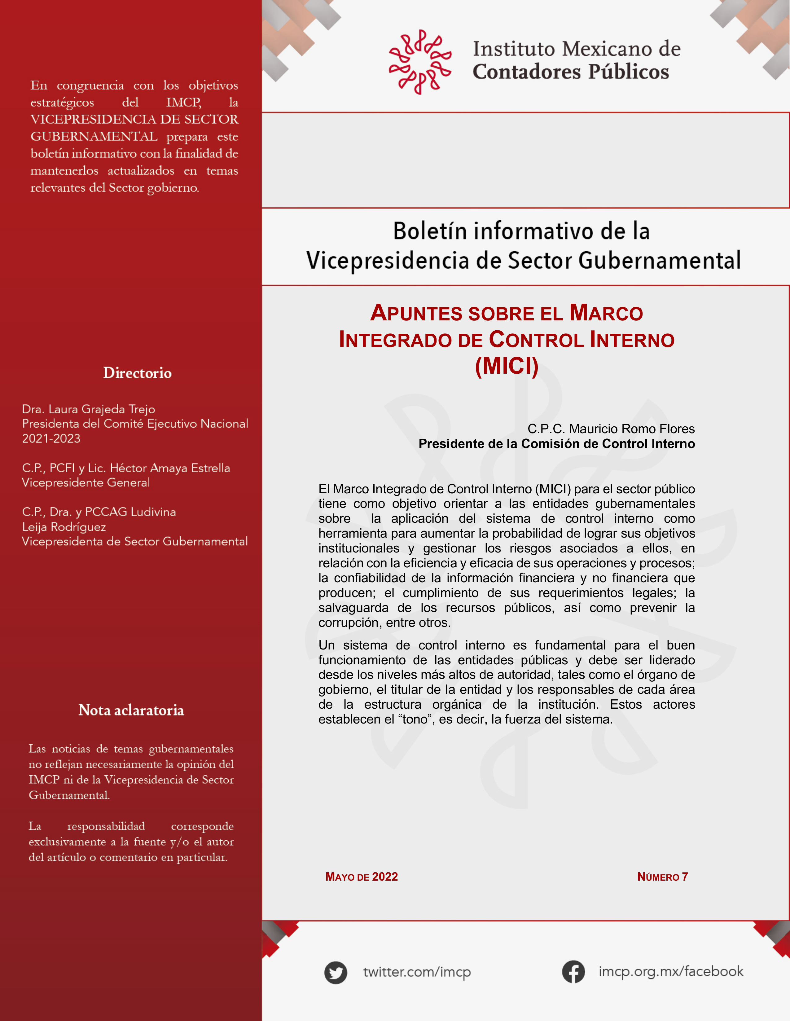 El Marco Integrado de Control Interno (MICI) para el sector público tiene como objetivo orientar a las entidades gubernamentales sobre  la aplicación del sistema de control interno como herramienta para aumentar la probabilidad de lograr sus objetivos institucionales y gestionar los riesgos asociados a ellos, en relación con la eficiencia y eficacia de sus operaciones y procesos; la confiabilidad de la información financiera y no financiera que producen; el cumplimiento de sus requerimientos legales; la salvaguarda de los recursos públicos, así como prevenir la corrupción, entre otros.
