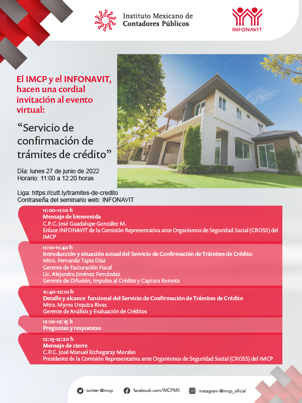 “Servicio de confirmación de trámites de crédito” admin_imcp Eventos, Servicios 27 junio, 2022 Consulta la grabación de la plática “Servicio de confirmación de trámites de crédito“, realizada el pasado 27 de junio de 2022, con la participación de funcionarios del INFONAVIT. Navegación de entradas Previous post A continuación, compartimos la nota relevante del día: ‘Sombrío’ panorama para México: Bancos centrales podrían subir tasas de interésNext post IMCP | Síntesis Informativa 27 junio 2022