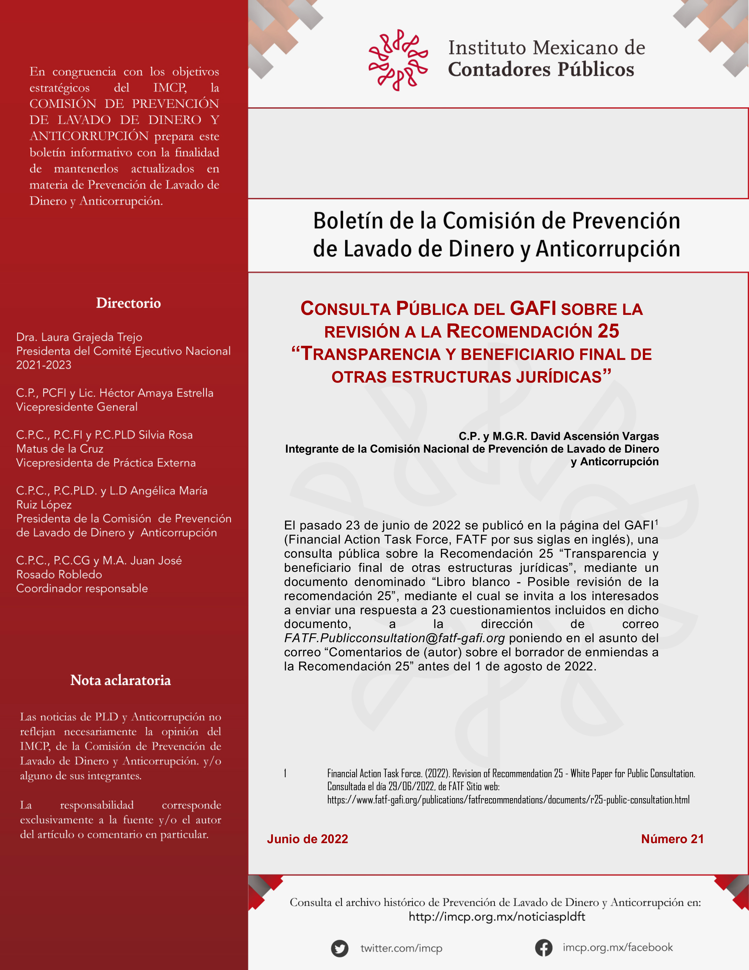 El pasado 23 de junio de 2022 se publicó en la página del GAFI1 (Financial Action Task Force, FATF por sus siglas en inglés), una consulta pública sobre la Recomendación 25 “Transparencia y beneficiario final de otras estructuras jurídicas”, mediante un documento denominado “Libro blanco – Posible revisión de la recomendación 25”, mediante el cual se invita a los interesados a enviar una respuesta a 23 cuestionamientos incluidos en dicho documento, a la dirección de correo FATF.Publicconsultation@fatf-gafi.org poniendo en el asunto del correo “Comentarios de (autor) sobre el borrador de enmiendas a la Recomendación 25” antes del 1 de agosto de 2022.