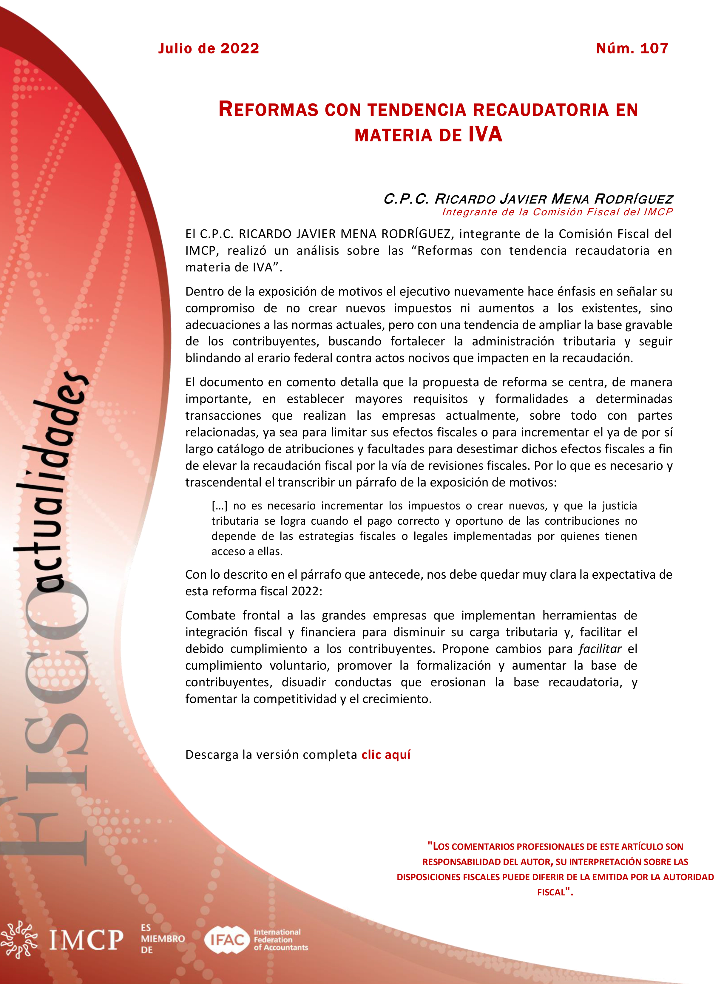 El C.P.C. RICARDO JAVIER MENA RODRÍGUEZ, integrante de la Comisión Fiscal del IMCP, realizó un análisis sobre las “Reformas con tendencia recaudatoria en materia de IVA”.