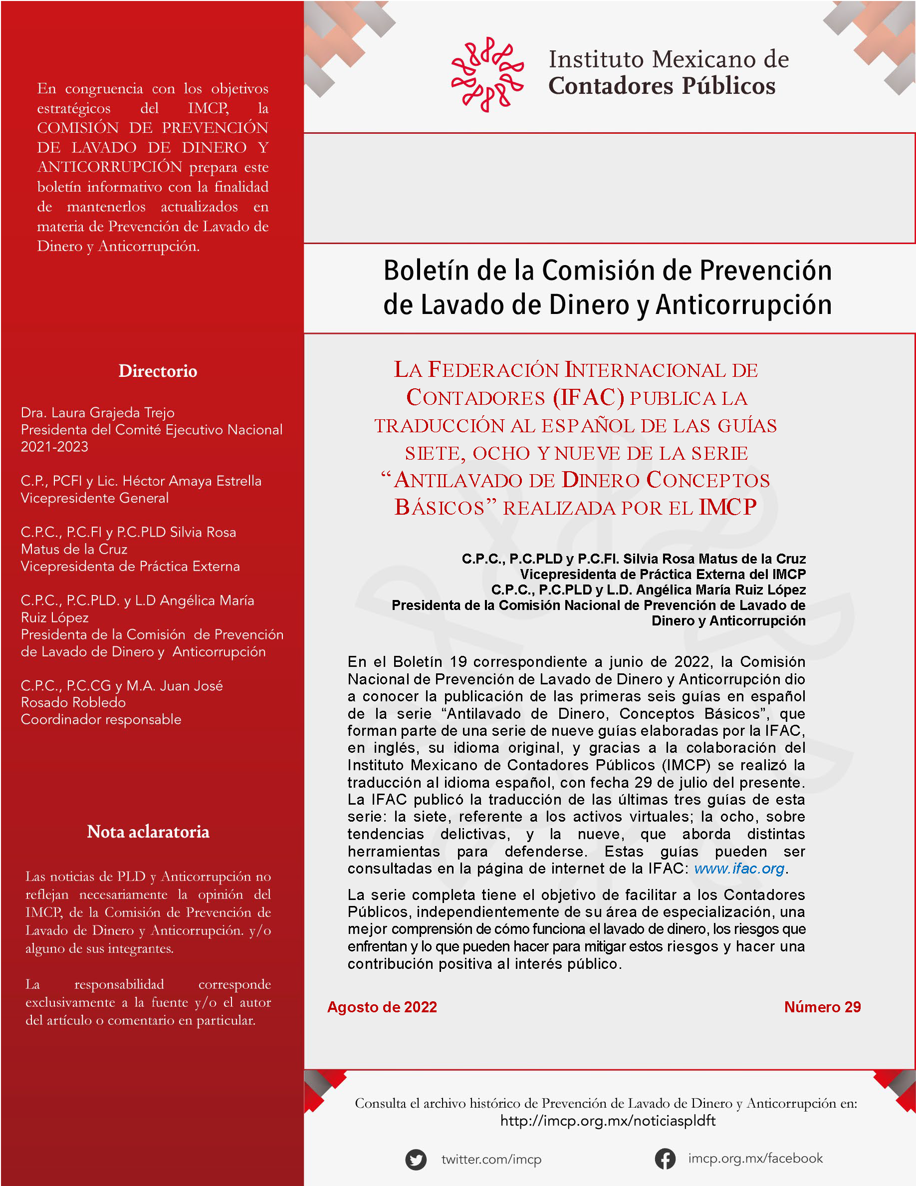 En el Boletín 19 correspondiente a junio de 2022, la Comisión Nacional de Prevención de Lavado de Dinero y Anticorrupción dio a conocer la publicación de las primeras seis guías en español de la serie “Antilavado de Dinero, Conceptos Básicos”, que forman parte de una serie de nueve guías elaboradas por la IFAC, en inglés, su idioma original, y gracias a la colaboración del Instituto Mexicano de Contadores Públicos (IMCP) se realizó la traducción al idioma español, con fecha 29 de julio del presente. La IFAC publicó la traducción de las últimas tres guías de esta serie: la siete, referente a los activos virtuales; la ocho, sobre tendencias delictivas, y la nueve, que aborda distintas herramientas para defenderse. Estas guías pueden ser consultadas en la página de internet de la IFAC: www.ifac.org.