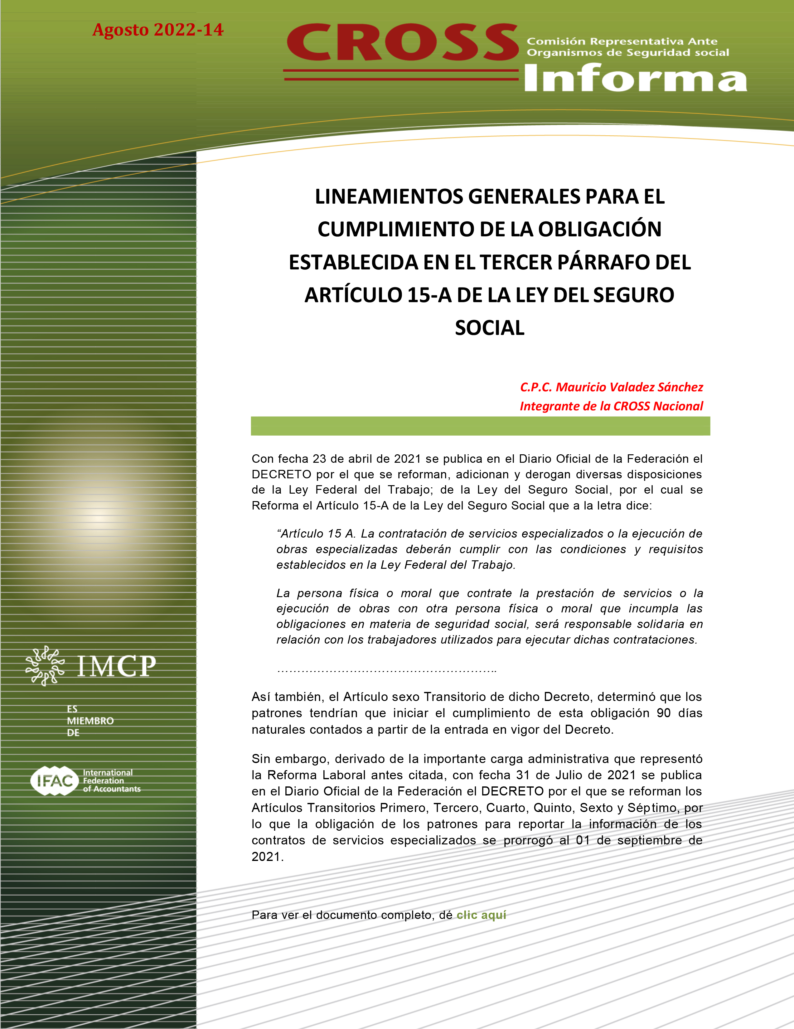 Boletín de Noticias de la CROSS 2022-14 LINEAMIENTOS GENERALES PARA EL CUMPLIMIENTO DE LA OBLIGACIÓN ESTABLECIDA EN EL TERCER PÁRRAFO DEL ARTÍCULO 15-A DE LA LEY DEL SEGURO SOCIAL