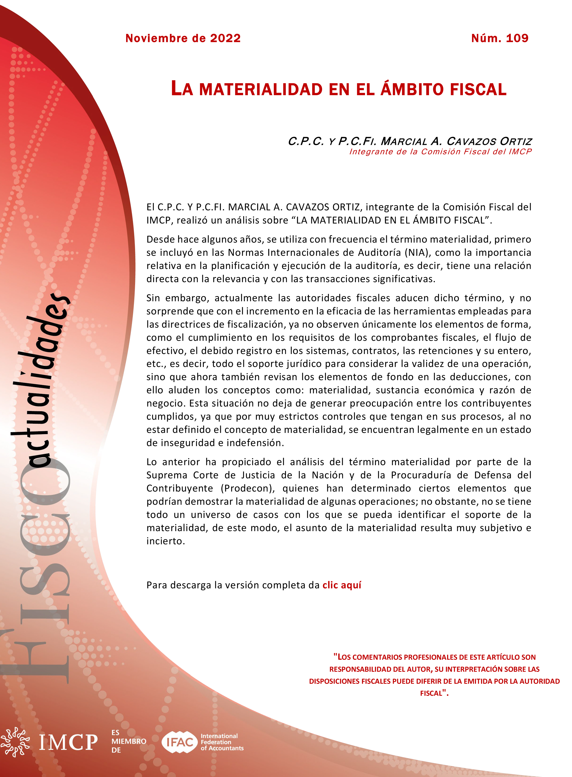El C.P.C. Y P.C.FI. MARCIAL A. CAVAZOS ORTIZ, integrante de la Comisión Fiscal del IMCP, realizó un análisis sobre “LA MATERIALIDAD EN EL ÁMBITO FISCAL”.