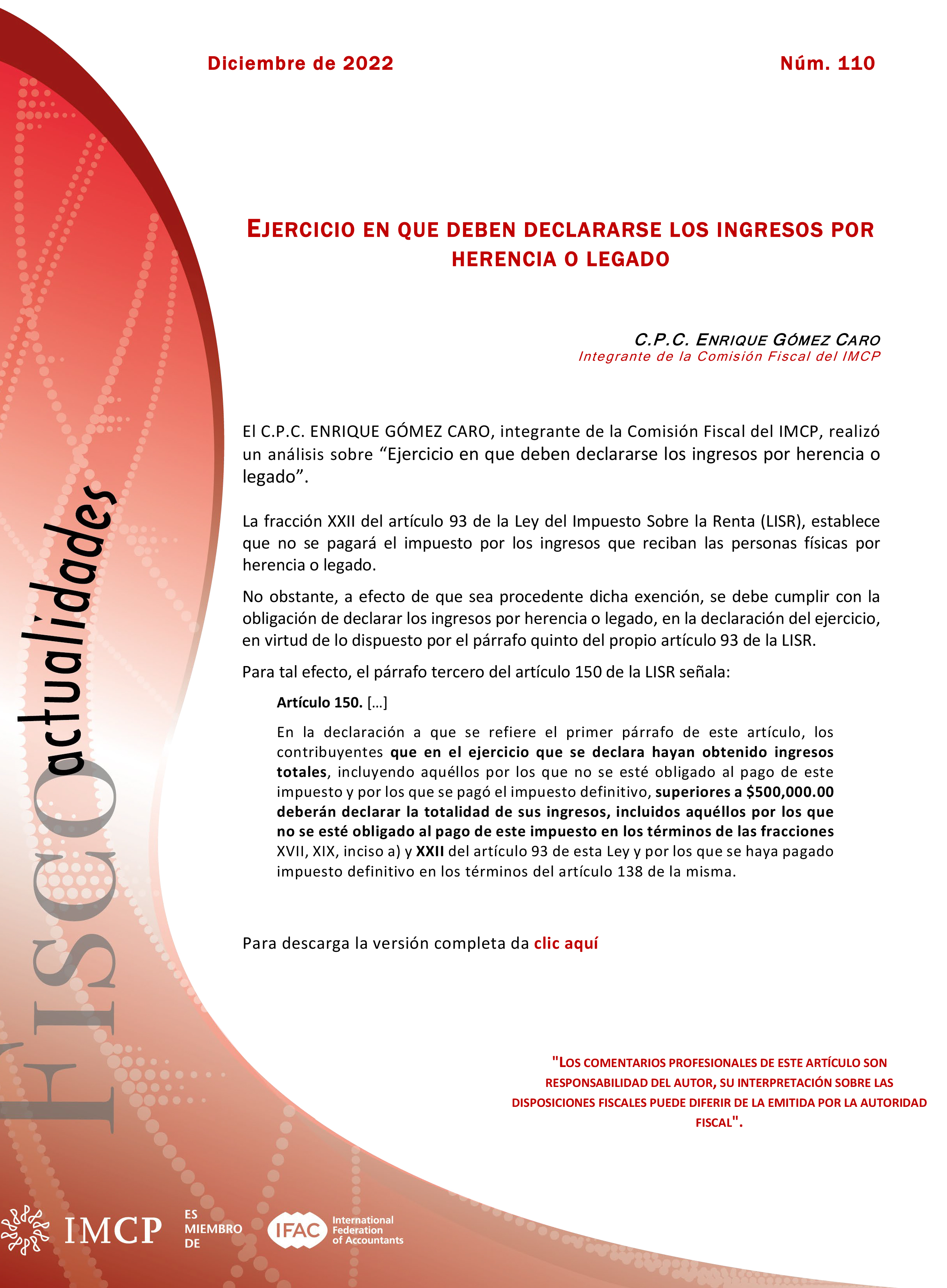 El C.P.C. ENRIQUE GÓMEZ CARO, integrante de la Comisión Fiscal del IMCP, realizó un análisis sobre “Ejercicio en que deben declararse los ingresos por herencia o legado”.