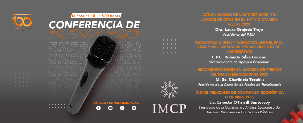Este miércoles 18 de enero de 2023 a las 11:00 h, se llevó a cabo la conferencia de prensa del Instituto Mexicano de Contadores Públicos, A.C. con la participación de: