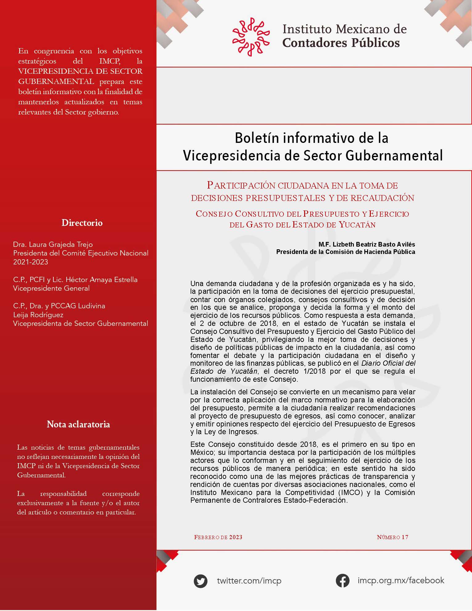 Una demanda ciudadana y de la profesión organizada es y ha sido, la participación en la toma de decisiones del ejercicio presupuestal, contar con órganos colegiados, consejos consultivos y de decisión en los que se analice, proponga y decida la forma y el monto del ejercicio de los recursos públicos. Como respuesta a esta demanda, el 2 de octubre de 2018, en el estado de Yucatán se instala el Consejo Consultivo del Presupuesto y Ejercicio del Gasto Público del Estado de Yucatán, privilegiando la mejor toma de decisiones y diseño de políticas públicas de impacto en la ciudadanía, así como fomentar el debate y la participación ciudadana en el diseño y monitoreo de las finanzas públicas, se publicó en el Diario Oficial del Estado de Yucatán, el decreto 1/2018 por el que se regula el funcionamiento de este Consejo.