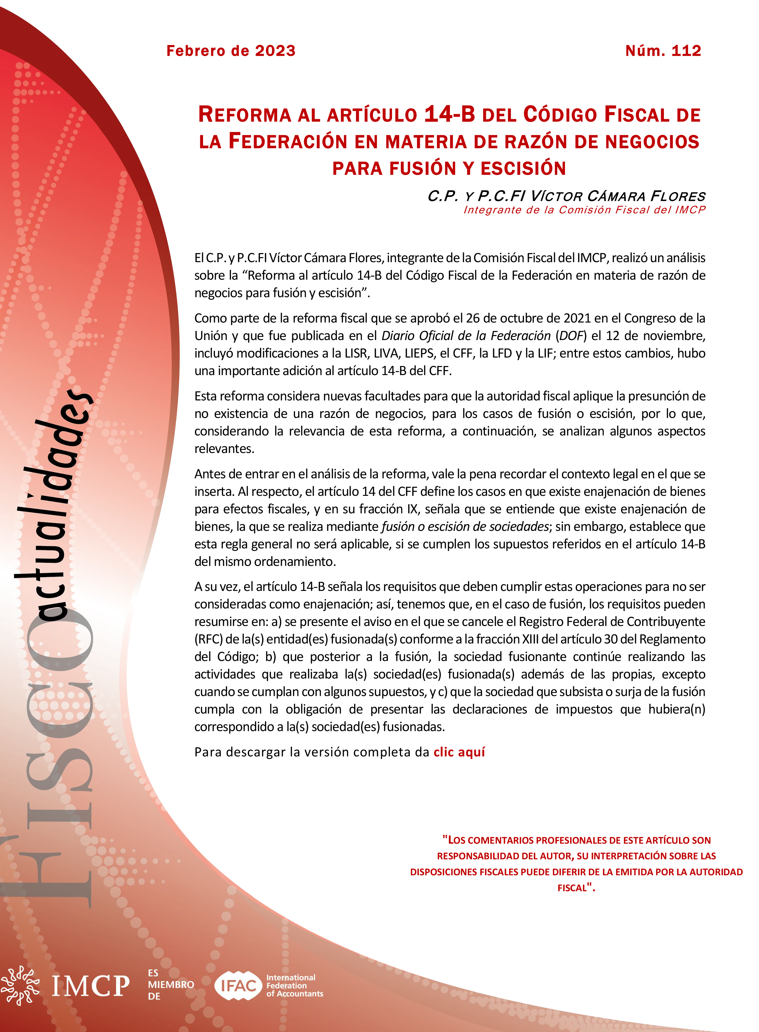 Fiscoactualidades_112 REFORMA AL ARTÍCULO 14-B DEL CÓDIGO FISCAL DE LA FEDERACIÓN EN MATERIA DE RAZÓN DE NEGOCIOS PARA FUSIÓN Y ESCISIÓN
