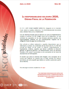 22 May Fiscoactualidades 2020-80 LA RESPONSABILIDAD SOLIDARIA 2020, CÓDIGO FISCAL DE LA FEDERACIÓN admin_imcp 0 Comments Con las reformas fiscales para el ejercicio en curso se implementaron ...