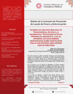 08 Nov Boletín de la Comisión Nacional de Prevención de Lavado de Dinero y Anticorrupción 41 / Noviembre 2022 admin_imcp 0 Comments Acuerdo del Instituto Nacional de Transparencia, Acceso a la Información y ...
