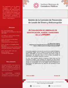 01 Feb Boletín de la Comisión Nacional de Prevención de Lavado de Dinero y Anticorrupción 42 / Enero 2023 admin_imcp 0 Comments Actualización de umbrales de identificación, avisos y sanciones de la LFPIORPI ...